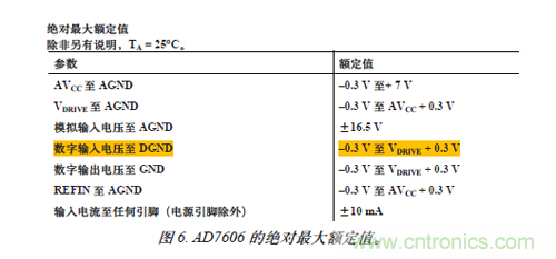 過沖和欠沖可能損壞輸入保護(hù)電路,或者縮短IC 的使用壽命。圖6 所示為 AD7606 的絕對最大額定值。數(shù)字輸入電壓應(yīng)在–0.3 V 和VDRIVE + 0.3 V 之間。另外,如果振鈴高于最大VIL 或小于最小VIH 可能導(dǎo)致邏輯誤差。