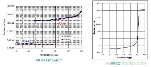 因此,不論哪種方式的快速充電,都是通過提高充電電流或功率來加速鋰電池芯內(nèi)部的反應(yīng)來實現(xiàn)的,必須通過更多的保護來防止由于電池芯的熱失控而引起的起火甚至爆炸。TE的PPTC和MHP-TA 可以有效地提供這種保護,MHP-TA是結(jié)合了雙金屬片和PPTC的溫度/電流保護器件,溫度保護更加精確,可以適用于電流較大、溫度保護要求更高的電子設(shè)備,如:智能手機、平板電腦、超級本、筆記本電腦等。MHP-TA及PPTC的特性及應(yīng)用如下圖,緊貼電池芯的設(shè)計可以使MHP-TA和PPTC更好的感測電池溫度,當電池溫度異常升高時可以呈現(xiàn)高阻,阻礙電池的充放電電流,確保電池的安全使用。