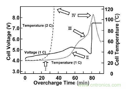下圖是鋰離子電池過充電測試的一個事例??梢钥闯龀潆娺^程中鋰離子電池芯內(nèi)部溫度和電壓的變化情況,正常1C充電時,電池芯的溫度隨恒流充電慢慢升高,而隨恒壓階段電流減小慢慢降低,整個過程溫度可控,安全。當大電流(2C或以上)時,電池芯內(nèi)部反應(yīng)劇烈發(fā)生熱失控,溫度急劇升高而發(fā)生起火或爆炸。