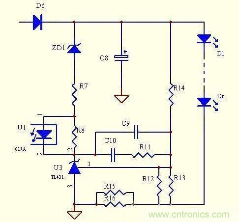 原理:此電路同樣是利用了TL431的2.495V的基準(zhǔn)來做恒流,跟上面的電路不同點(diǎn)在于減少了電流取樣電路的電壓,只要合計設(shè)計R12,R13,R14的值,可以限制LED上面的壓降。
