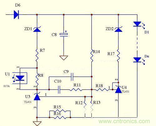 缺點(diǎn):由于TL431是2.5V基準(zhǔn),故恒流取樣電路的損耗極大,不適合做輸出電流過大的電源。而此電路的致命缺陷是不能空載,故不適合做外置式的LED電源,所以下面我們對線路的一些缺陷進(jìn)行了改進(jìn)。