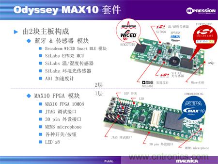 MAX 10 FPGA板卡以Altera的MAX10為核心,帶有30個插針的擴展接口、紐扣電池接口、JTAG調(diào)試接口、各種開關(guān)/按鈕和8個LED。藍(lán)牙及傳感器板集成了一個藍(lán)牙4.0模塊、一個32位處理器、溫度/濕度傳感器、紫外線/光敏/距離傳感器和加速度傳感器。