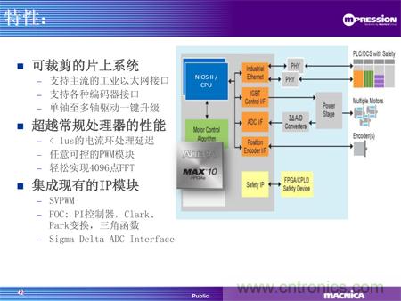 同期推出的還有駿龍科技基于MAX® 10 FPGA的電機驅(qū)動方案,通過FPGA實現(xiàn)馬達(dá)控制的算法核心,提供了高性能、定制化和單芯片的解決方案,為馬達(dá)控制帶來革命性的質(zhì)的飛躍。使用FPGA 替代傳統(tǒng)的CPU/DSP架構(gòu)實現(xiàn)算法,意味著所有的算法都將通過硬件實現(xiàn),這樣由于處理能力限制而在CPU中無法實現(xiàn)的算法,現(xiàn)在都可以在MAX® 10 FPGA中以輕松地實現(xiàn)。Altera的MAX 10支持EtherCAT、Powerlink、Mechatrolink等工業(yè)以太網(wǎng)接口以及Endat 2.2, BISS等編碼器接口,用戶可以該方案中實現(xiàn)靈活可定制的接口。該方案還提供可定制的調(diào)試界面,客戶可以根據(jù)自己的需求,定制自己的調(diào)試界面,實時觀測內(nèi)部信號。