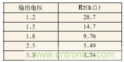 表1為當(dāng)R1為10kΩ時,幾種輸出電壓下R2的推薦值。