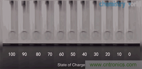 通過gif圖片我們可以發(fā)現(xiàn),不同電量的電池在同一高度向下落的時(shí)候幾乎在同一時(shí)間落到地面,但是媒介電池觸地反彈的高度會(huì)因電池剩余電量的不同而出現(xiàn)差異。