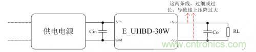 根據(jù)數(shù)據(jù)手冊要求連接E2405UHBD-30W電源模塊外圍電路,負(fù)載使用電子負(fù)載儀加滿載,供電電源使用可編程直流電源。模塊上電,電子負(fù)載儀上顯示的電壓值不是5.0V,而是4.7V,然而在測量電源模塊輸出引腳兩端的電壓值是5.0V。什么原因呢?E2405UHBD-30W模塊滿載時,輸出電流有6A,而模塊引腳到負(fù)載儀端口之間的連接線太長了,使得連接線的阻抗值大。如果阻抗為0.05歐姆,那么連接線上的電壓差為0.05Ω*6A=0.3V,這個就是模塊輸出引腳到負(fù)載儀端口的壓差。