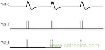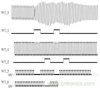 參照圖3錯動式訊號圖,W7_3為受電線圈訊號、W7_1與W7_2分別為P04與P11訊號、W7_4為S1訊號,其與W7_3不同在于通過一個C1電容之諧振效果后取得較強電流推力,其波形也會接近方波訊號;W7_5與W7_6分別為S12與S22訊號,從圖3中可看到設(shè)計中的調(diào)制訊號從線圈兩端分別進行調(diào)制,并分成調(diào)制單端、解除調(diào)制、調(diào)制另一單端后再解除調(diào)制完成,此設(shè)計的用意在于對受電線圈接收電力影響最小的情況下,產(chǎn)生最大調(diào)制訊號。