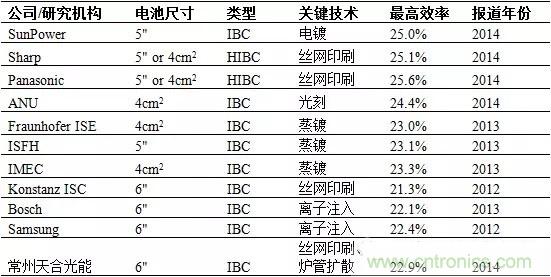 在IBC結(jié)構(gòu)上,SunPower公司的研發(fā)遙遙領(lǐng)先,其它研究成果如德國FraunhoferISE的23%,ISFH的23.1%,IMEC的23.3%等等。最近,日本的研發(fā)人員將IBC與異質(zhì)結(jié)(HJ)技術(shù)相結(jié)合,在2014年將晶體硅電池的效率突破到25%以上。其中日本Sharp和Panasonic公司將IBC與HJ技術(shù)結(jié)合在一起,研發(fā)的晶硅多結(jié)電池效率分別達(dá)到25.1%和25.6%。