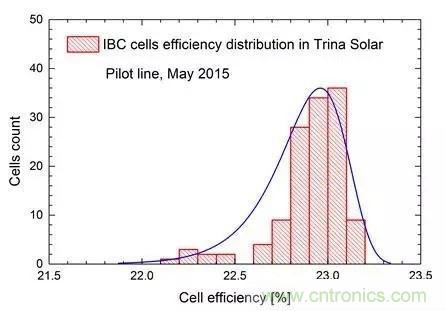 同年,由常州天合光能光伏科學(xué)與技術(shù)國家重點(diǎn)實(shí)驗(yàn)室獨(dú)立研發(fā)的6英寸大面積IBC電池效率已達(dá)22.9%,成為了6英寸IBC電池的最高轉(zhuǎn)換效率。同時(shí),天合光能依托國家863項(xiàng)目建成中試生產(chǎn)線,進(jìn)入2015年后,天合光能科研人員采用最新開發(fā)的工藝,在中試生產(chǎn)線做出了平均22.8%,最高23.15%(內(nèi)部測(cè)試)的結(jié)果,大部分電池效率在22%以上,如圖1所示,達(dá)到了目前工業(yè)級(jí)6英寸晶體硅電池效率的最高水平(SunPower電池均為5英寸)。