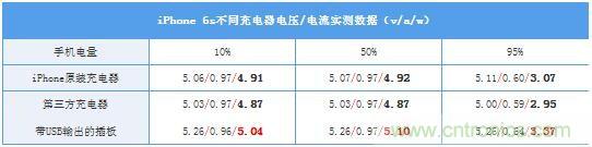筆者使用了5款不同品牌原配的充電器+2款帶USB輸出的插板進行測試(手機50%電量),發(fā)現輸出電壓基本略微大于5v(某些線補較高的能去到5.3v,而沒有線補的低于5v),而電流也在1a左右。所以使用某些非原裝充電頭對iPhone進行充電,確實會比原裝充電頭更快。當然,山寨/品質低劣的充電器就另說了。