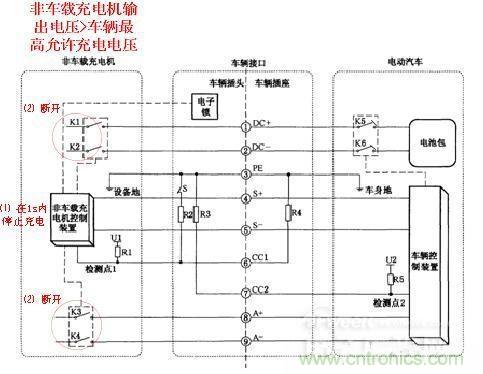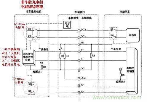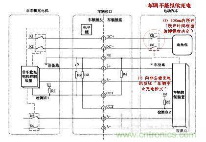2)在充電過(guò)程中,非車(chē)載充電機(jī)控制裝置通過(guò)對(duì)檢測(cè)點(diǎn)1的電壓進(jìn)行檢測(cè),如果判斷車(chē)輛接口由完全連接變?yōu)閿嚅_(kāi)(如車(chē)輛意外移動(dòng)、充電槍線纜被意外擾動(dòng)等),則控制非車(chē)載充電機(jī)停止充電,應(yīng)在100ms內(nèi)斷開(kāi)K1、K2、K3、K4。