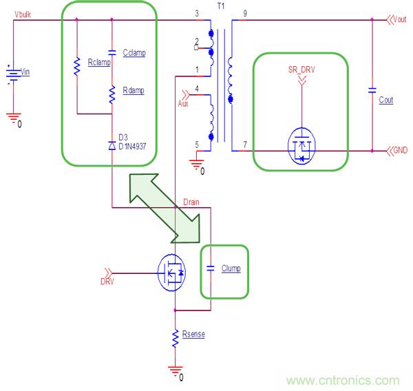 準(zhǔn)諧振模式允許使用相對大的緩沖電容Clump,額外增加的Clump (10-22pF)可以減少M(fèi)OS管關(guān)斷損耗,減少電磁干擾(EMI)。準(zhǔn)諧振反激有利于次極端加SR,可降低整流二極管導(dǎo)通損耗,減少次極端整流管尖峰電壓,降低其耐壓要求。