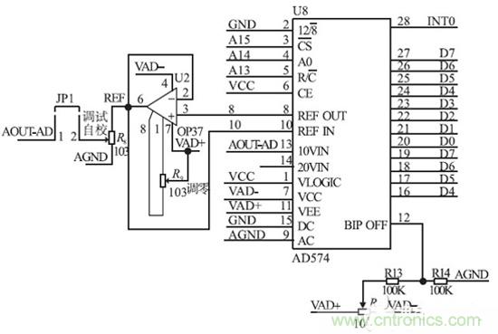 A/ D 采樣輸入電路如圖4 所示。為了滿足取樣精度需要,我們選擇12 bit A/ D