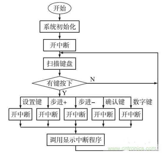 采用數(shù)字控制策略比模擬控制的有無可比擬的優(yōu)勢(shì):實(shí)現(xiàn)不同的控制算法;數(shù)字PID 具有設(shè)計(jì)周期短,調(diào)試和升級(jí)方便。數(shù)字控制系統(tǒng)主程序圖如圖6 所示。在系統(tǒng)加電后,主程序首先完成系統(tǒng)初始化,其中包括A/ D、D/ A、串行口、中斷、定時(shí)/ 計(jì)數(shù)器等工作狀態(tài)的設(shè)定,給系統(tǒng)變量賦初值,顯示上次設(shè)定值等。然后掃描獲取鍵值,判斷設(shè)定鍵、校準(zhǔn)鍵是否按下,執(zhí)行相應(yīng)的功能子程序。當(dāng)啟動(dòng)鍵按下后,根據(jù)設(shè)定值、校正等參數(shù)計(jì)算對(duì)應(yīng)輸出的數(shù)字量,再進(jìn)行閉環(huán)反饋調(diào)整,如圖6 所示。