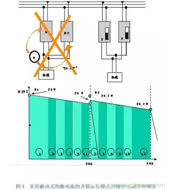 被動式均衡電流的并聯(lián)運行模式特點是:當輸出電流增大時,其輸出電壓會微量的減少,其輸出電壓是所謂的軟特性:輸出電壓隨著輸出電流的增加而稍微下降。其電源在空載到滿負載之間的輸出電壓的波動大約為4%~5%額定電壓即1V左右。這樣當二個電源并聯(lián)時,由于不同的電流負載產生了不同的輸出電壓,一個是有稍高輸出的電壓的電源首先承受負載電流,隨著電流量的增加,這個電源輸出電壓略降,低于另一個電源的輸出電壓,這樣另一電源承受負載電流,通過這樣階梯式交替的方法達到均衡電流的作用。均衡電流的平衡程度如何,取決于所有并聯(lián)電源的輸出電壓的初始調節(jié)和設置值。必需指出,這個方法的實現(xiàn)其輸出電源必須采用一個共同的接線端。