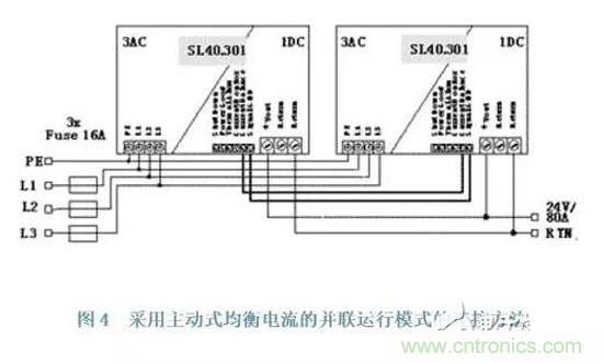 主動式均衡電流的并聯(lián)模式必須采用一根附加的均流線,這根均流線作為反饋信號傳送到電源的控制器來調節(jié)每個電源在所有的條件下提供相同的輸出電流,這時,電源電壓輸出的軟特征是不需要的,輸出電壓在任何場合下不受電流大小的影響,所以與被動式均衡電流相比,其輸出電壓精度高,同時與輸出電路的類型無關;但是對于開發(fā)和安裝來說,費用較高,因為在電源內部需要一個精確度較高的電流測試線路和一個附加的電流調節(jié)器,同時也多一個接線端口。PULS電源的SL40.301三相24/40A的電源采用這種技術,所有的電源經過均流線和地線相連接,如圖4所示。