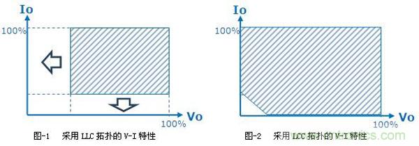 目前大功率恒流LED驅動電源的設計,比較常見的軟開關拓撲是LLC,它的輸出V-I特性如圖-1所示。從圖中可見,LLC拓撲的輸出電壓、電流范圍下限都比較高。隨著用戶對調(diào)光要求的越來越高,LLC拓撲的這種輸出特性的局限性也越來越明顯。如果輸出直接恒流,LLC拓撲在恒流時的電壓不能夠達到很低,即對燈珠個數(shù)的適應性有較大局限性;當需要對電壓相對固定的特定燈串時進行調(diào)光的時候,調(diào)光電流在相對較窄的頻率范圍內(nèi)不能達到比較低范圍。如果需要做到深的調(diào)光深度,往往需要間歇工作以達到小的平均電流,甚至采用額外一級DC/DC電流來實現(xiàn),產(chǎn)生額外的紋波電流或增加系統(tǒng)成本及降低效率。