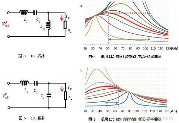 兩圖中虛線是恒流軌跡線,當負載電阻變化時,工作頻率需要做相應的變化使得電流保持穩(wěn)定不變,從圖-4中可以看出,采用LLC拓撲實現(xiàn)恒流輸出時,不同負載線之間的間隔較大,意味著頻率變化較大。而從圖-6中可以看出,采用LCC拓撲實現(xiàn)恒流輸出時,不同負載線之間的間隔比較緊密,意味著頻率變化較小。也就是說,LCC拓撲實現(xiàn)恒流時,頻率隨負載變化的范圍比LLC的要小很多。