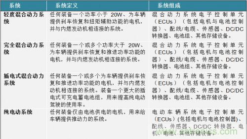 隨著世界范圍的人們對(duì)更高能源效率的交通方式的需求增加,HEV/EVs將首當(dāng)其沖,成為人們的首要選擇的交通方式。為了更好的了解電動(dòng)與混合動(dòng)力車(chē)輛市場(chǎng)的潛力與發(fā)展情況,我們不可避免的要知道在本文中提到的是什么類(lèi)型的車(chē)輛。在Strategy Analytics[1]的報(bào)告中:“2007年到2021年混合動(dòng)力車(chē)輛系統(tǒng)的需求預(yù)測(cè),”將HEV/EV分為四類(lèi):