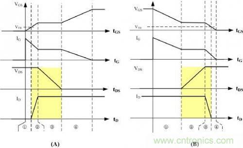 開關(guān)導(dǎo)通時對應(yīng)的波形圖如圖2(A),開關(guān)截止時對應(yīng)的波形圖如圖2(B),可以看到開關(guān)管每次導(dǎo)通、截止時開關(guān)管VDS電壓和流過開關(guān)管的電流ID存在交疊的時間(圖中黃色陰影位置),從而造成損耗P1,那么在開關(guān)頻率fs工作狀態(tài)下總損耗PS= P1 *fs,即開關(guān)頻率提高時,開關(guān)導(dǎo)通與截止的次數(shù)越多,損耗也越大。