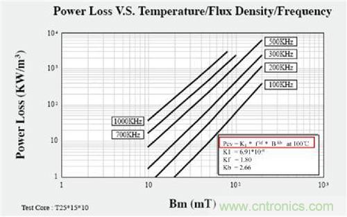 如圖4所示,變壓器鐵損是和開關(guān)頻率的kf次方成正比,又與磁性溫度的限制有關(guān),所以隨著開關(guān)頻率的提高,高頻電流在線圈中流通產(chǎn)生嚴(yán)重的高頻效應(yīng),從而降低了變壓器的轉(zhuǎn)換效率,導(dǎo)致變壓器溫升高,從而限制開關(guān)頻率提高。