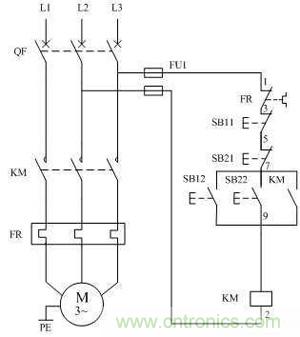 有了點動和連動的知識,這個圖中接觸器KM的作用就不必多說了。圖中SB11和SB21為停止按鈕,SB12和SB22為啟動按鈕。其中把任意一個啟動按鈕和停止按鈕安裝在同一個按鈕箱內(nèi),另外兩個也安裝在另外一個按鈕箱內(nèi)。兩個按鈕箱可分別放在控制室和電動機旁。