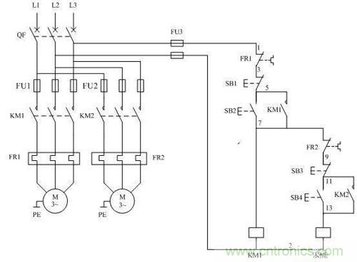 若需要其它電機在M2啟動后才能啟動,則把該電機的控制回路與M2的控制回路串聯(lián)。