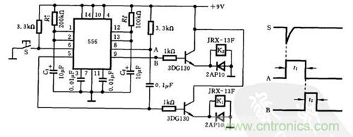 A 脈沖結束時產生的負跳變又觸發(fā)第二級定時器,產生延時脈沖B,驅動繼電器K2 ,B 的延遲時間 t2= ~ 1.1R2xC2