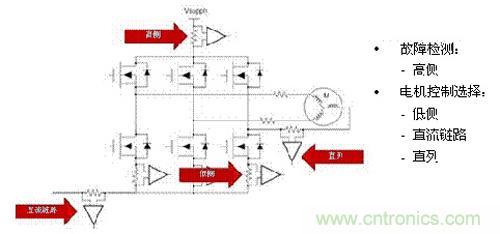 如圖1所示,基本上有三種不同的方法來測量三相電動機驅(qū)動系統(tǒng)中的電流:低側(cè)、直流鏈路和直列測量。圖1所示的是傳統(tǒng)三相PWM逆變器,該逆變器使用三對功率MOSFET(絕緣柵雙極晶體管IGBT也很常見)來驅(qū)動直流電動機。該圖還包括高側(cè)電流感應(yīng),其通常在顯著錯誤情況下使用,比如接地電路短路的情況。
