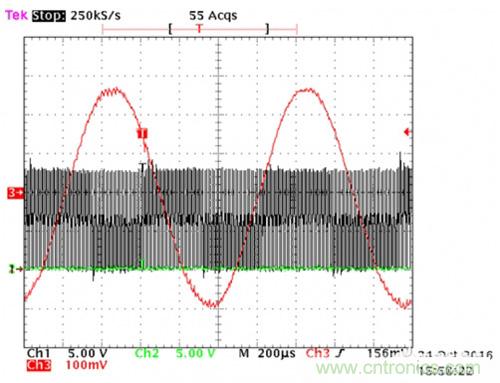 直列式電流感應(yīng)方法看似是最合理的,因為這是最終要測量的電流。但這種方法存在一個問題。驅(qū)動MOSFET或IGBT的PWM信號對電流感應(yīng)放大器造成嚴重破壞。感測電阻處的共模信號從電源電壓被驅(qū)動到接地,具有非??焖俚乃矐B(tài)開關(guān)特性,而電流感應(yīng)放大器試圖測量感測電阻本身的小差分信號。圖2是由PWM逆變器產(chǎn)生的正弦相電流(紅色波形)的示波器截圖。這種情況下,PWM頻率為100兆赫(MHz),由LMG5200 GaN半橋功率級提供(更多詳細信息,請參見底部的TI設(shè)計)。需要注意的是,快速開關(guān)信號是直列式電流感應(yīng)放大器測量相電流時所接收的信號。這就像在有颶風的情況下,當杯子在海上漂浮,而試圖測量杯中液體一樣。難怪大多數(shù)設(shè)計師會考慮使用低側(cè)感應(yīng)!下面我們將介紹另外一種方法。
