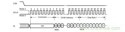 其實,無論是對芯片的擦除,編程還是讀取操作,我們大致可以按照以下的套路來:寫命令---寫地址---寫(讀)數(shù)據(jù)。正如以下的時序圖一樣清晰明了,我們先把片選信號拉低,再發(fā)個0x02頁編程命令,再發(fā)個地址,就可以輕松寫數(shù)據(jù)了。