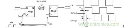 時(shí)序偏斜分析圖如圖 3所示。時(shí)鐘的分析起點(diǎn)是源寄存器(Reg1),終點(diǎn)是目標(biāo)寄存器(Reg2)。時(shí)鐘在圖中的結(jié)構(gòu)中傳輸也會(huì)有延遲,時(shí)鐘信號(hào)從時(shí)鐘源傳輸?shù)皆醇拇嫫鞯难訒r(shí)為T(mén)c2s,傳輸?shù)侥繕?biāo)寄存器的延時(shí)為T(mén)c2d。時(shí)鐘網(wǎng)絡(luò)的延時(shí)為T(mén)c2s與Tc2d之差,即Tskew=Tc2d-Tc2s。
