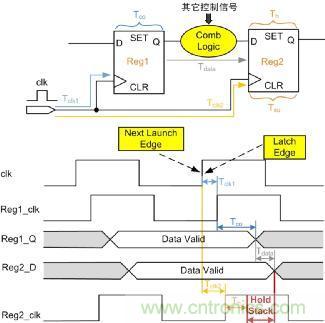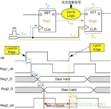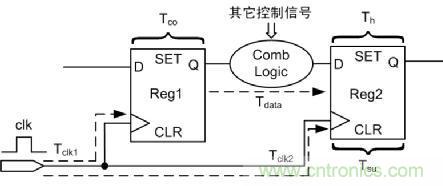 如圖 6所示,為分析建立時(shí)間/保持時(shí)間的基本電路圖。Tclk1為Reg1的時(shí)鐘延時(shí),Tclk2為Reg2的時(shí)鐘延時(shí),Tco為Reg1固有延時(shí),Tdata為Reg1的到Reg2之間組合邏輯的延時(shí),Tsu為Reg2的建立時(shí)間,Th為Reg2的保持時(shí)間,設(shè)時(shí)鐘clk周期為T(mén),這里分析數(shù)據(jù)的建立時(shí)間和保持時(shí)間。