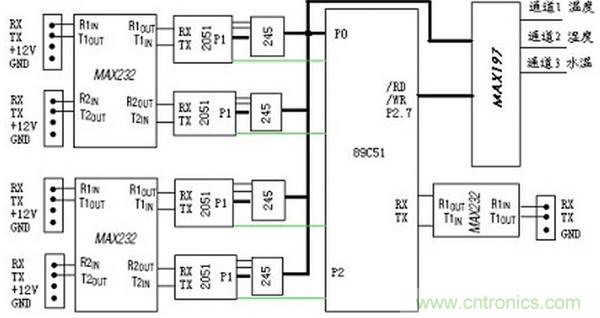 經(jīng)過分析,我們分別使用一塊2051單片機接收各路串口傳感器的數(shù)據(jù),同時使用一塊多路高精度ADC對轉(zhuǎn)換成電壓的溫度等信號采樣,系統(tǒng)結(jié)構(gòu)圖如圖1所示。主從機之間的具體管腳連接參見圖2。
