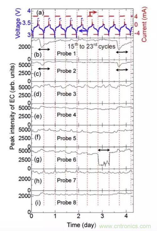 在研究Li+濃度的變化過(guò)程中,Toshiro Yamanaka還發(fā)現(xiàn)電解液的分布也隨著充放電而發(fā)生變化。下圖是在充放電過(guò)程中不同位置溶劑EC的強(qiáng)度的變化趨勢(shì),EC的強(qiáng)度變化主要反映該處電解液的數(shù)量多少,隨著電芯的體積變化,電芯內(nèi)的電解液分布也在不斷的發(fā)生著變化。例如在1號(hào)和2號(hào)位置,EC的濃度發(fā)生了兩次快速下降和緩慢恢復(fù),6號(hào)探測(cè)器的位置,則出現(xiàn)了EC濃度的快速下降和快速上升,這些變化都反映了鋰離子電池內(nèi)部在充放電過(guò)程中,由于電極的體積膨脹,導(dǎo)致電解液在電芯的局部發(fā)生變干、再浸潤(rùn)的過(guò)程。