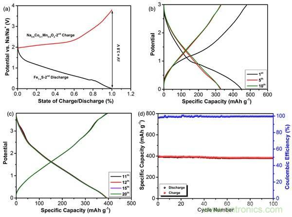 (a)Na0.6Co0.1Mn0.9O2正極和Fe1-xS負極充放電曲線對比;Na0.6Co0.1Mn0.9O2/Fe1-xS全電池在電流密度20 mA g-1時的電化學(xué)性能(b,c)充放電曲線;(d)循環(huán)穩(wěn)定性曲線。