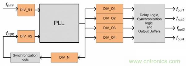 圖 1 為高性能時鐘設(shè)備的基本 PLL 架構(gòu)。該設(shè)計使用比例因子為 PLL 輸出端口提供時鐘合成。最終輸出頻率的基本公式為: