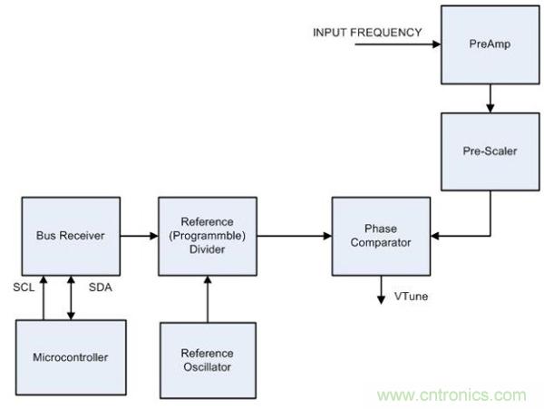 如圖 2 所示,將時鐘 IC 連接到微控制器電路。時鐘 IC 具有內(nèi)部 PLL 模塊,其功能是提供作為固定直流電壓的調(diào)諧電壓 (Vtune) ,而調(diào)諧電壓將隨頻段而變化。PLL 模塊在輸入端接收本地振蕩器頻率,由內(nèi)部前置放大器放大信號。另外,預(yù)分頻器對輸入頻率進行下變頻,并將其作為輸入傳送至相位比較器。