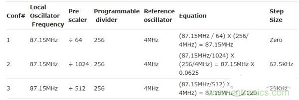 步長 =(本地振蕩器頻率/預(yù)分頻器)X(可編程分頻器/參考振蕩器)