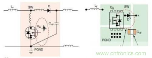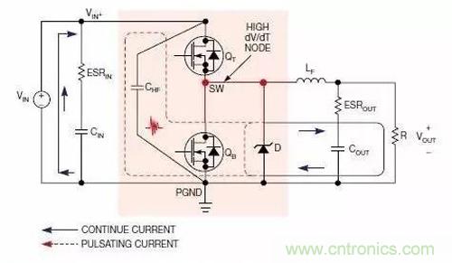 圖4顯示的是升壓轉(zhuǎn)換器中的連續(xù)電流回路與脈沖電流回路。此時(shí),應(yīng)在靠近MOSFET QB與升壓二極管D的輸出端放置高頻陶瓷電容CHF.