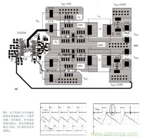 圖6和圖7(略)提供了一個(gè)同步降壓電路的例子,它強(qiáng)調(diào)了去耦電容的重要性。圖6a是一個(gè)雙相12VIN、2.5VOUT/30A(最大值)的同步降壓電源,使用了LTC3729雙相單VOUT控制器IC.在無負(fù)載時(shí),開關(guān)結(jié)點(diǎn)SW1和SW2的波形以及輸出電感電流都是穩(wěn)定的(圖6b)。但如果負(fù)載電流超過13A,SW1結(jié)點(diǎn)的波形就開始丟失周期。負(fù)載電流更高時(shí),問題會(huì)更惡化(圖6c)。