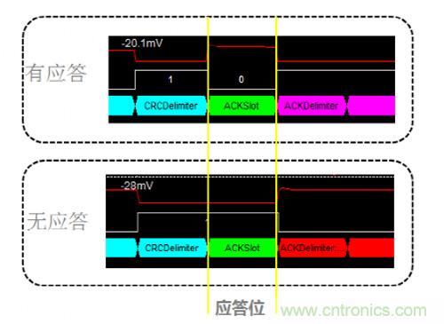 為什么會(huì)發(fā)生這種錯(cuò)誤呢?發(fā)送報(bào)文的節(jié)點(diǎn)會(huì)在ACK段發(fā)送兩個(gè)隱性位,若在第一個(gè)位期間接收到顯性電平則認(rèn)為該幀被正確接收。由于仲裁段相同時(shí)兩節(jié)點(diǎn)都認(rèn)為自己取得仲裁權(quán),在ACK段等待應(yīng)答,但該網(wǎng)絡(luò)中僅存在兩個(gè)節(jié)點(diǎn),因此在ACK段不能收到應(yīng)答,進(jìn)而發(fā)生應(yīng)答定界符錯(cuò)誤。簡(jiǎn)單說來這種情形就類似于總線中只有一個(gè)節(jié)點(diǎn)將不能實(shí)現(xiàn)數(shù)據(jù)發(fā)送。圖7是在ACK段有無應(yīng)答時(shí)的波形對(duì)比。