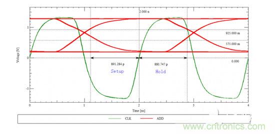 由上圖3.我們可以知道,該地址信號的建立時間大約為891ps,保持時間為881ps。這是在時鐘與地址信號完全等長情況下的波形。如果地址與時鐘不等長,信號又是什么樣的呢?仿真中,我們讓地址線比時鐘線慢200ps,得到的與眼圖如下: