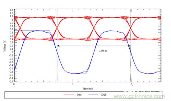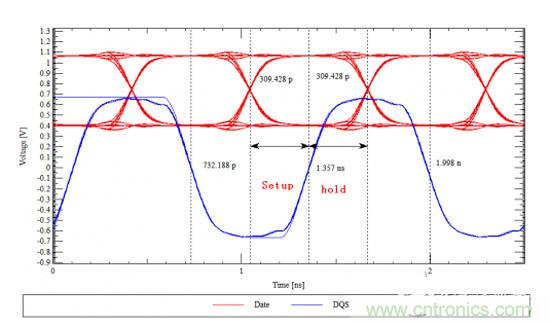 由上圖可知,在地址信號比時鐘信號長的情況下,保持時間為684ps,建立越為1.1ns。可見,相對于地址線與時鐘線等長來說,地址線比時鐘線長會使地址信號的建立時間更短。同理,如果時鐘線比地址線長,則建立時間會變長,而保持時間會變短。那么雙倍速率的數(shù)據(jù)信號又是怎樣的?下面通過具體的仿真實例來看一下。