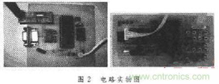 對應(yīng)于上述框圖的電路實物圖如圖2所示。其左右兩個電路分別對應(yīng)上述框圖中的左右兩個部分??傮w來說,它包括電平轉(zhuǎn)換電路、單片機(jī)處理部分、無線收發(fā)部分(CCll00收發(fā)器 )、液晶顯示模塊和鍵盤輸入模塊五個部分。