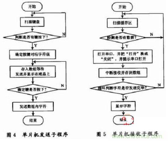 單片機(jī)程序主要包括主程序、單片機(jī)發(fā)送子程序、單片機(jī)接收子程序、液晶顯示子程序、鍵盤輸入子程序五部分,均采用C語言進(jìn)行模塊化編程。由于篇幅原因,下面只給出了單片機(jī)發(fā)送子程序和接收子程序,如圖4,圖5所示。