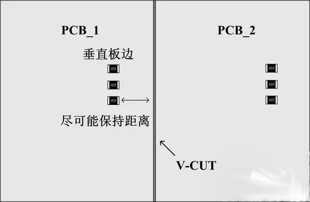 貼片電阻的另外一種常見的損壞是機械損傷后呈開路狀態(tài),后續(xù)導致電路異常(器件外觀有可能正常)。下面是幾個小建議:1、如果是手折板的話(極少使用,無法機器分析,毛刺大),貼片電阻長度方向平行于PCB板邊,零件受的應(yīng)力小;如果是V-CUT的話,貼片器件長度方向垂直于PCB邊,零件破裂可能性較小。2、元件如果與連接處垂直,到連接處的距離建議要≥4mm,若平行,距離建議要≥1.5mm.3、在成本允許的情況下,適當加厚PCB板厚度,特別是面積比較大的板子。(下面是兩個簡單的示意圖,實際情況請實際分。)