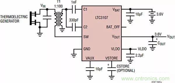 凌力爾特公司有一種基于LTC3107的能量采集解決方案,可用于給無線系統(tǒng)網(wǎng)絡(luò)和充電電池進行供電,見圖16。