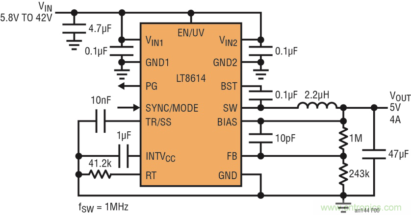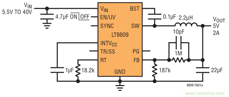 一個(gè)很好的例子是 LT8609,這是一款 2A、42V 輸入同步降壓型開(kāi)關(guān)穩(wěn)壓器。獨(dú)特的同步整流拓?fù)涮峁?93% 的效率,而以 2MHz 頻率切換使設(shè)計(jì)師能夠避開(kāi)關(guān)鍵噪聲敏感頻段,例如 AM 無(wú)線電,同時(shí)可提供占板面積非常緊湊的解決方案。突發(fā)模式 (Burst Mode®) 運(yùn)行在無(wú)負(fù)載備用情況下保持靜態(tài)電流低于 2.5μA,從而使該器件非常適合始終保持接通的系統(tǒng)。LT8609 的 3.0V 至 42V 輸入電壓范圍使其非常適合汽車應(yīng)用,這類應(yīng)用必須以低至 3.0V 的最低輸入電壓穩(wěn)定通過(guò)冷車發(fā)動(dòng)和停-啟情況,并穩(wěn)定通過(guò)超過(guò) 40V 的負(fù)載瞬態(tài)。其內(nèi)部 3.5A 開(kāi)關(guān)可在峰值負(fù)載電流為 3A 時(shí),提供高達(dá) 2A 的連續(xù)輸出電流。原理圖和相應(yīng)于 2MHz 切換頻率的效率曲線如圖 3 所示。
