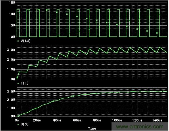 由于0 < D < 1,很明顯電路可以作為一種分壓器,不管負載RL所需的電流如何,公式(1)都保持不變。最初,電感電流的一大部分對C進行充電,電路一旦達到穩(wěn)定狀態(tài),電容電流將平均為零,因此電感提供的平均電流IL等于負載要求的平均電流IO。在上面的例子中,IL= IO= VO/RL= 3A。